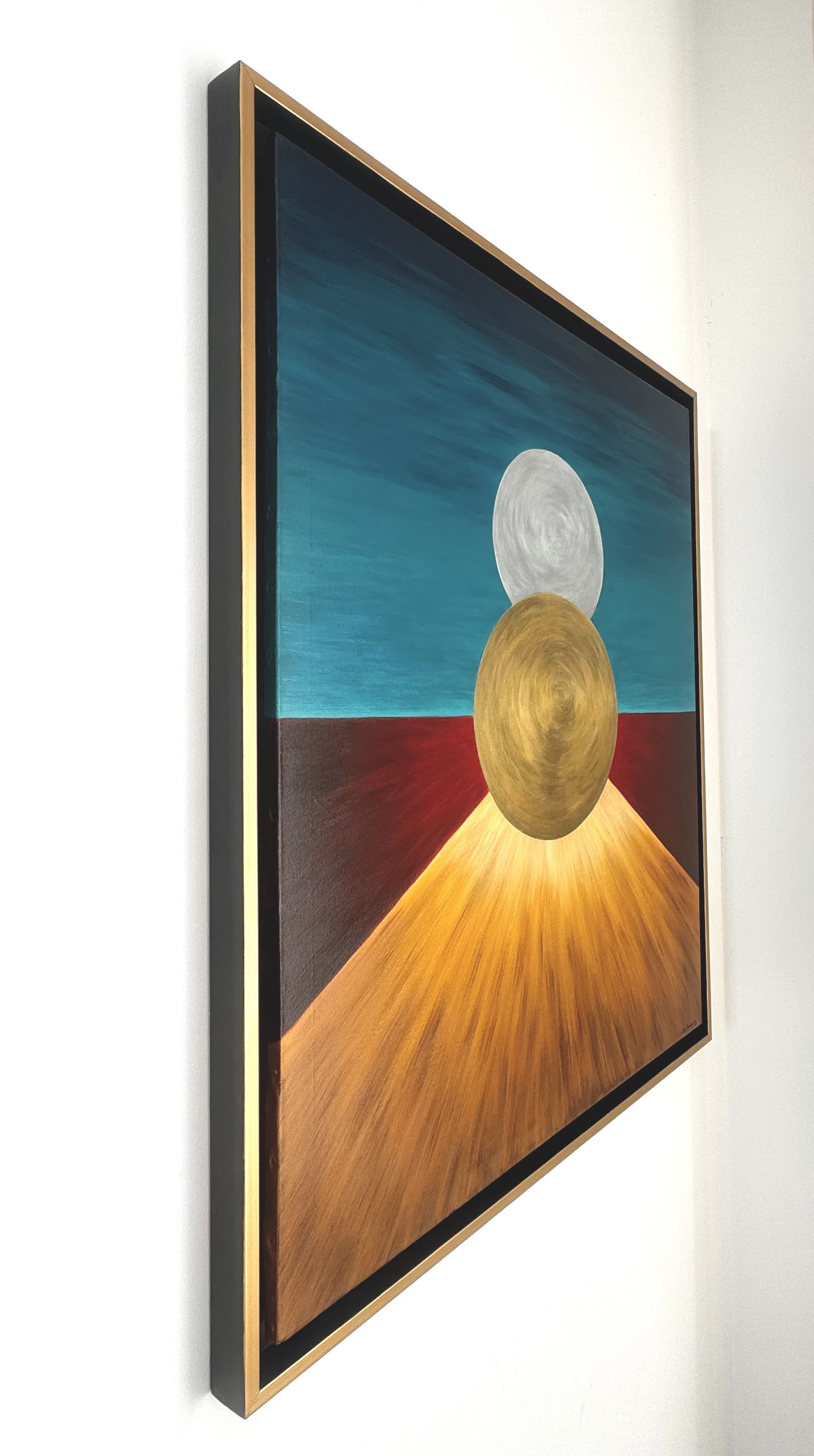 Ce tableau est encadré dans une caisse américaine noire et or.