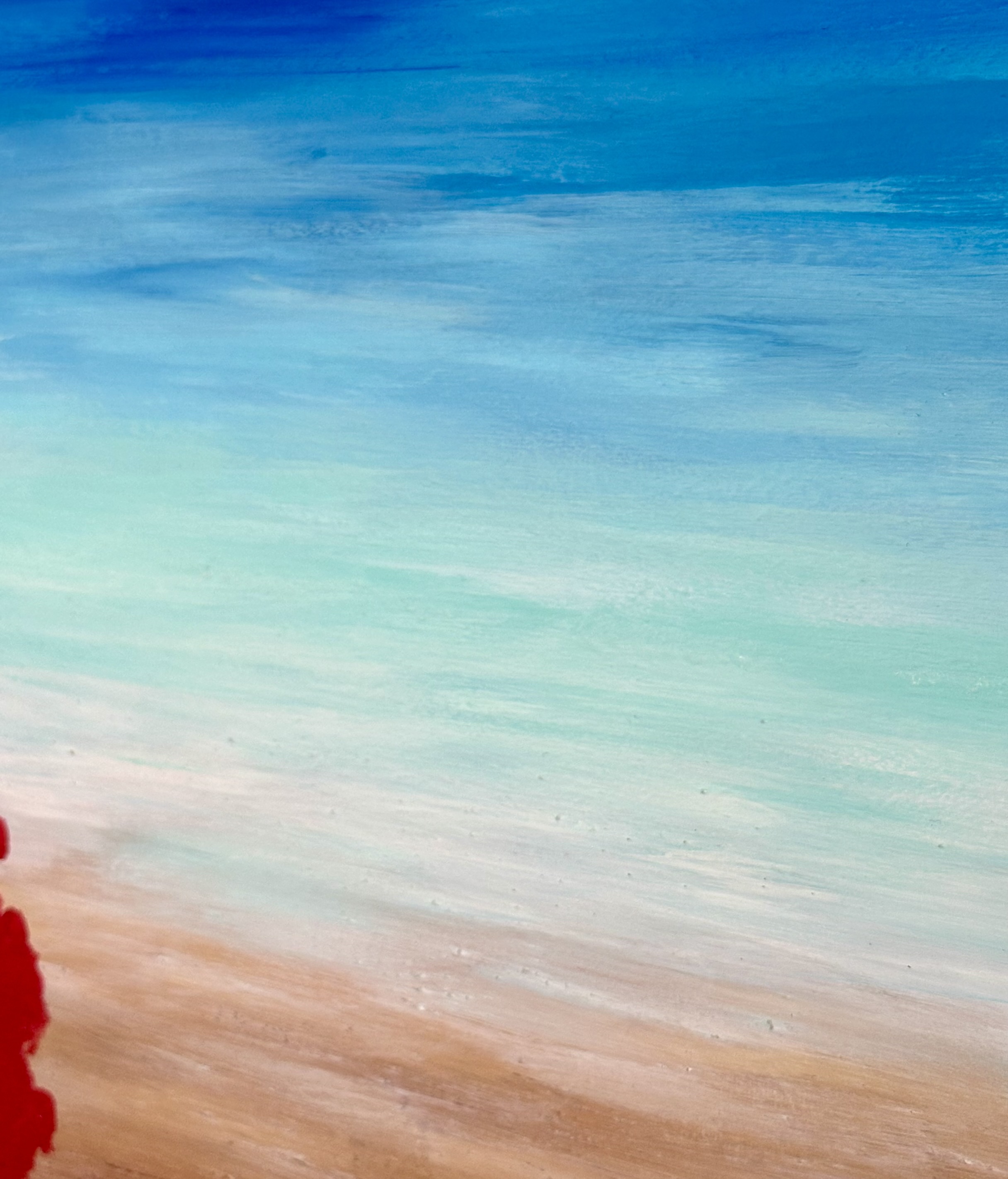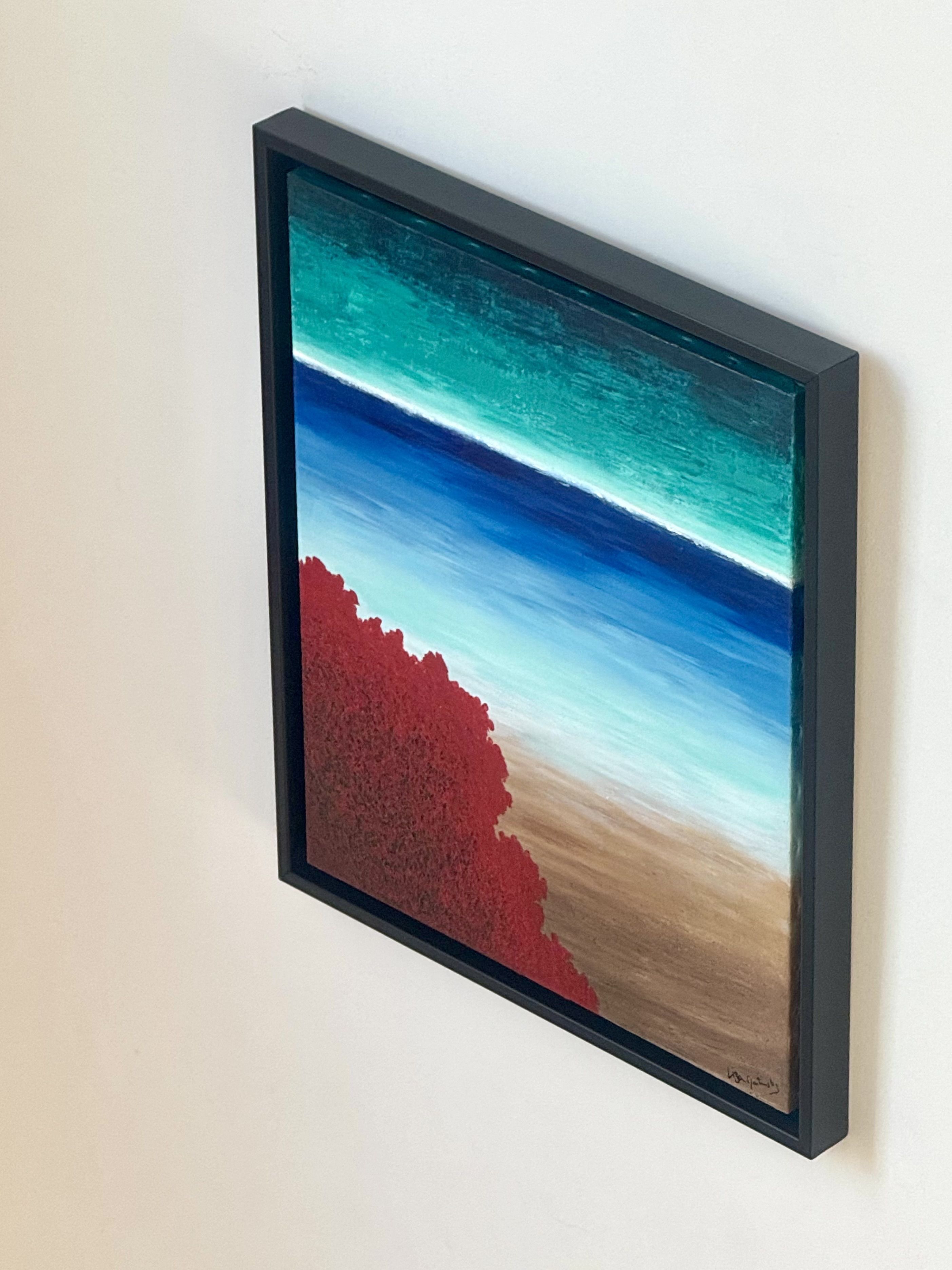 En épurant le paysage, j'ai cherché la frontière entre figuration et abstraction. J'ai choisi des contrastes chromatiques puissants avec des teintes de bleu et de turquoise profond face à des teintes de rouge et de terre afin de capturer, l'espace d'un instant, cette solitude sereine.