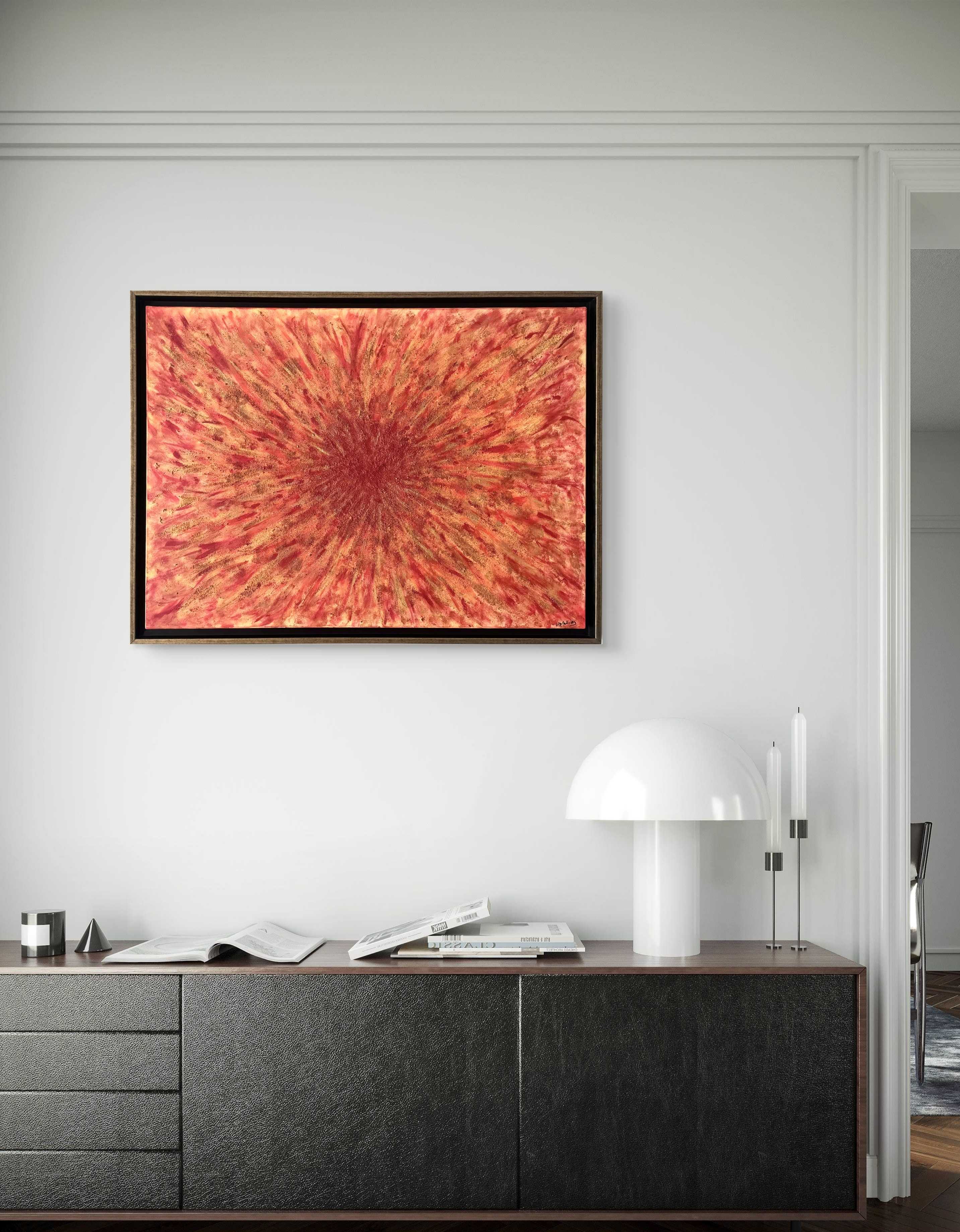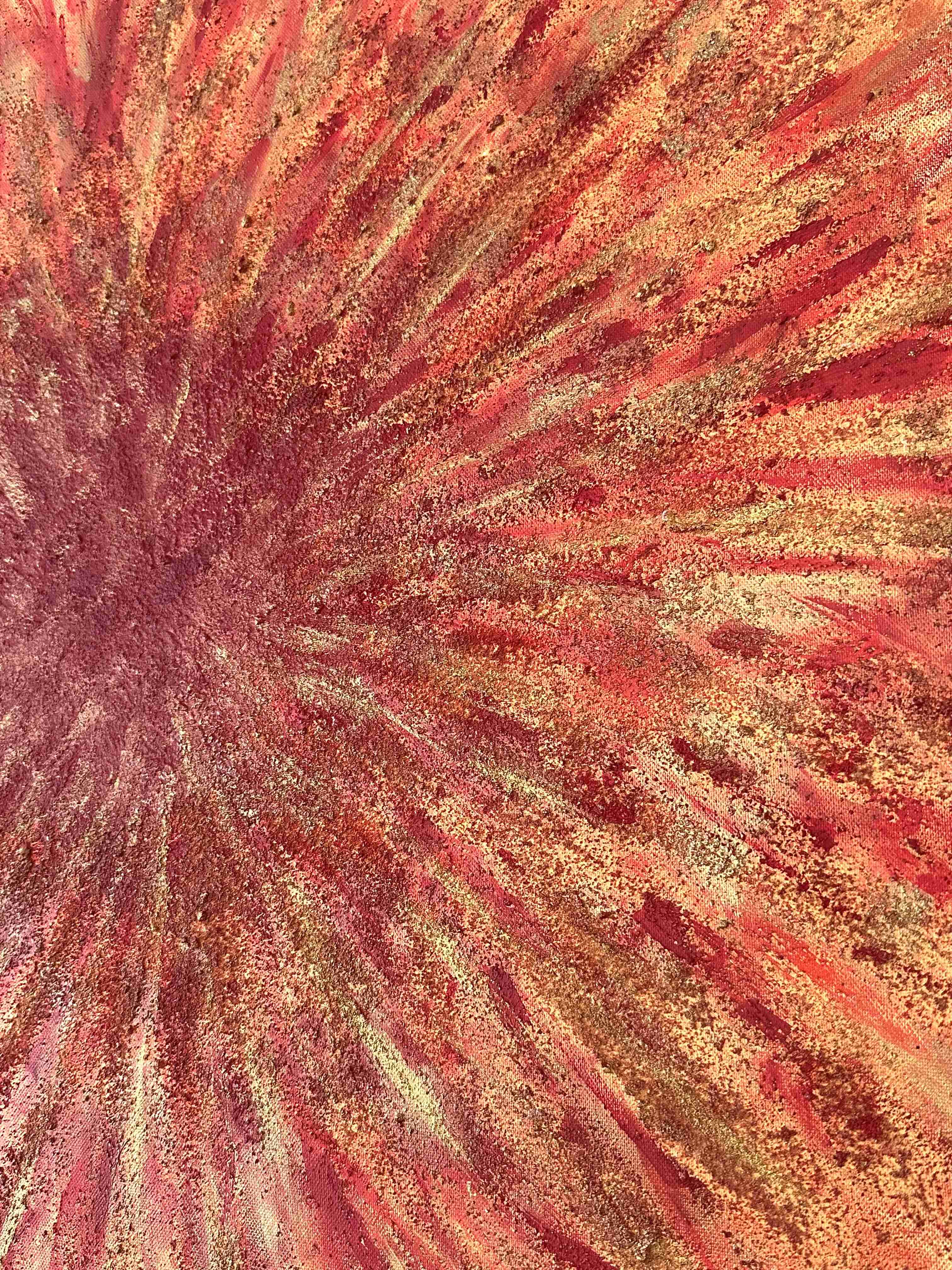 Le rouge profond évoque la vie et la passion, tel un battement de cœur. L’or apporte une dimension sacrée et solaire à l’œuvre en venant l’illuminer comme un soleil.