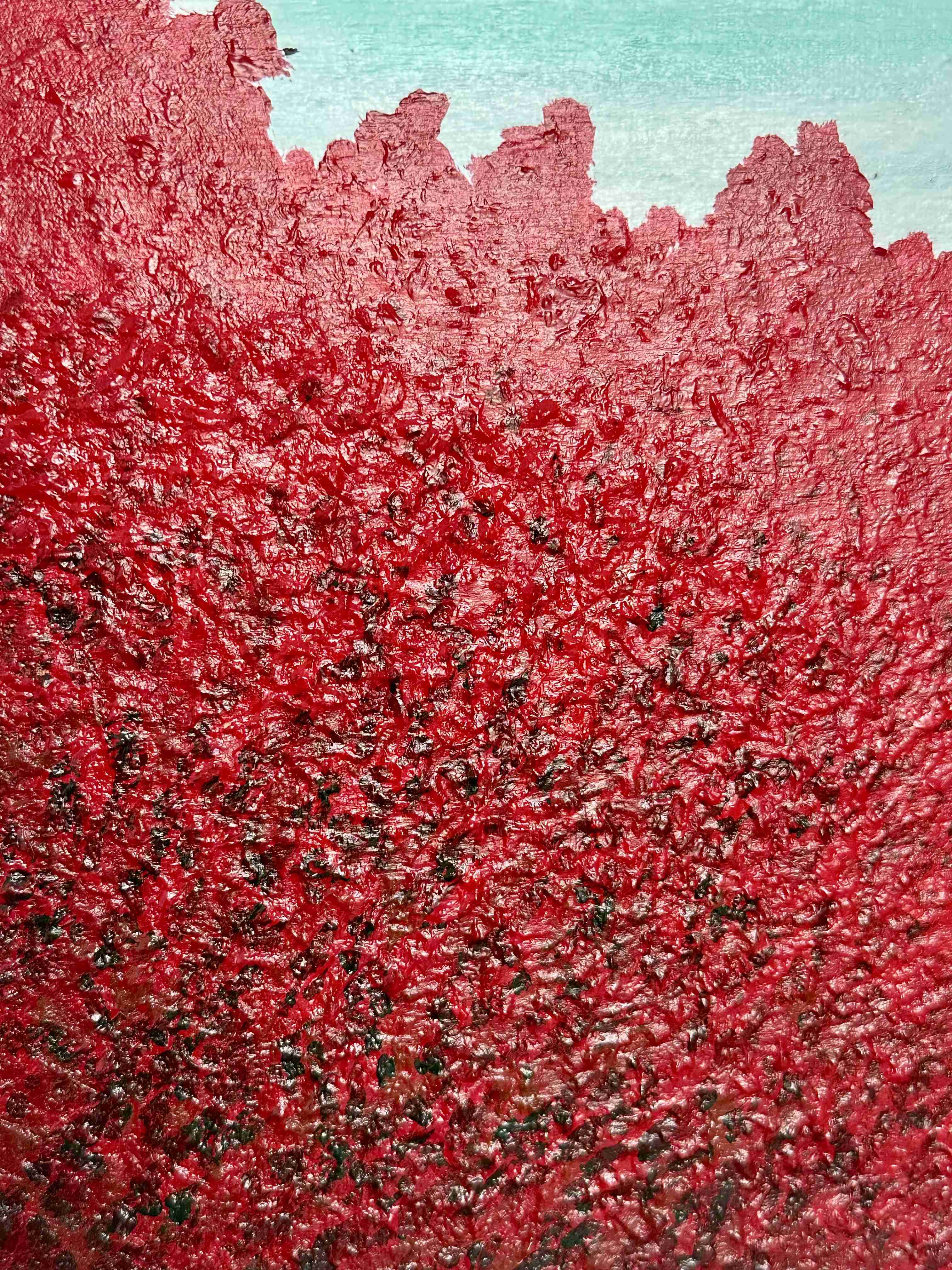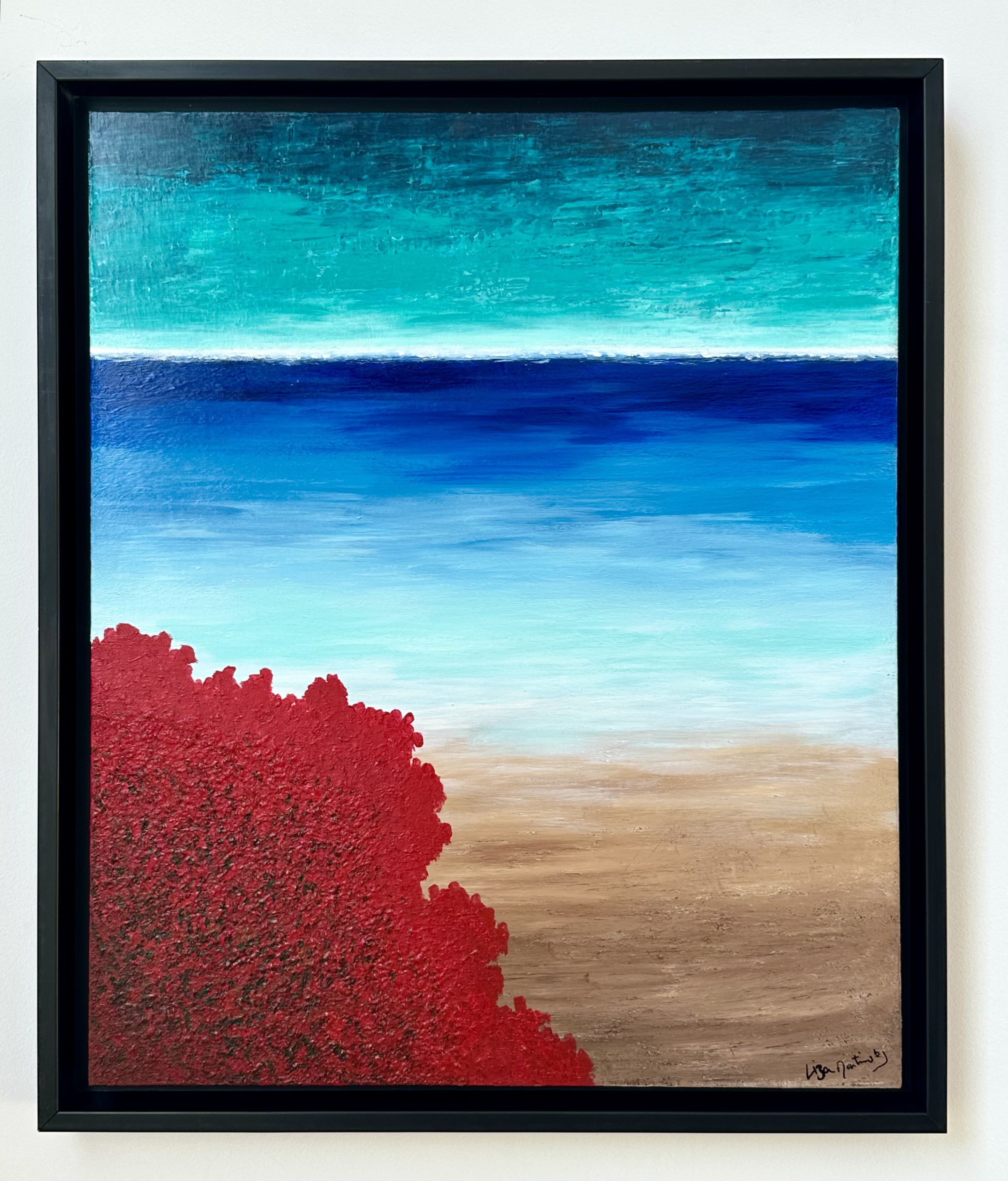 En épurant le paysage, j'ai cherché la frontière entre figuration et abstraction. J'ai choisi des contrastes chromatiques puissants avec des teintes de bleu et de turquoise profond face à des teintes de rouge et de terre afin de capturer, l'espace d'un instant, cette solitude sereine.